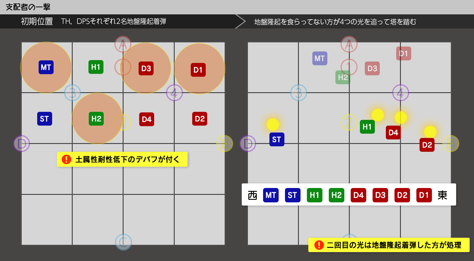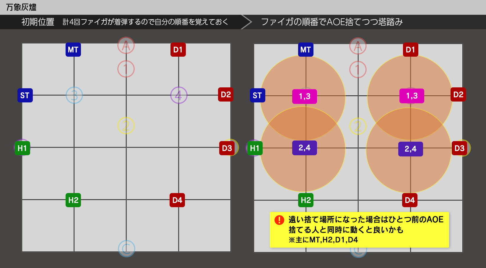 /p 【万象灰燼:はいじあ/ビジョン式】 /p MT D1 /p ST + + D2 ※1,3番塔は前+で範囲捨て /p H1 + + D3 ※2,4番塔は後+で範囲捨て /p H2 D4 /p 【概念2回目①】 【概念2回目②】 /p 無/早α │ 遅α /p 単 │ 生物 /p 早β │ イフ イフ 遅β /p 複/遅 │ 生物 /p 早γ │ 遅γ /p ※4塔:遅αβ→北で合成 遅γ/早余り→南で合成 /p 【支配者の一撃】 【塔優先度】 /p MTH1 D3 D1 西>MTSTH1H2D4D3D2D1>東 /p ST H2 D4 D2