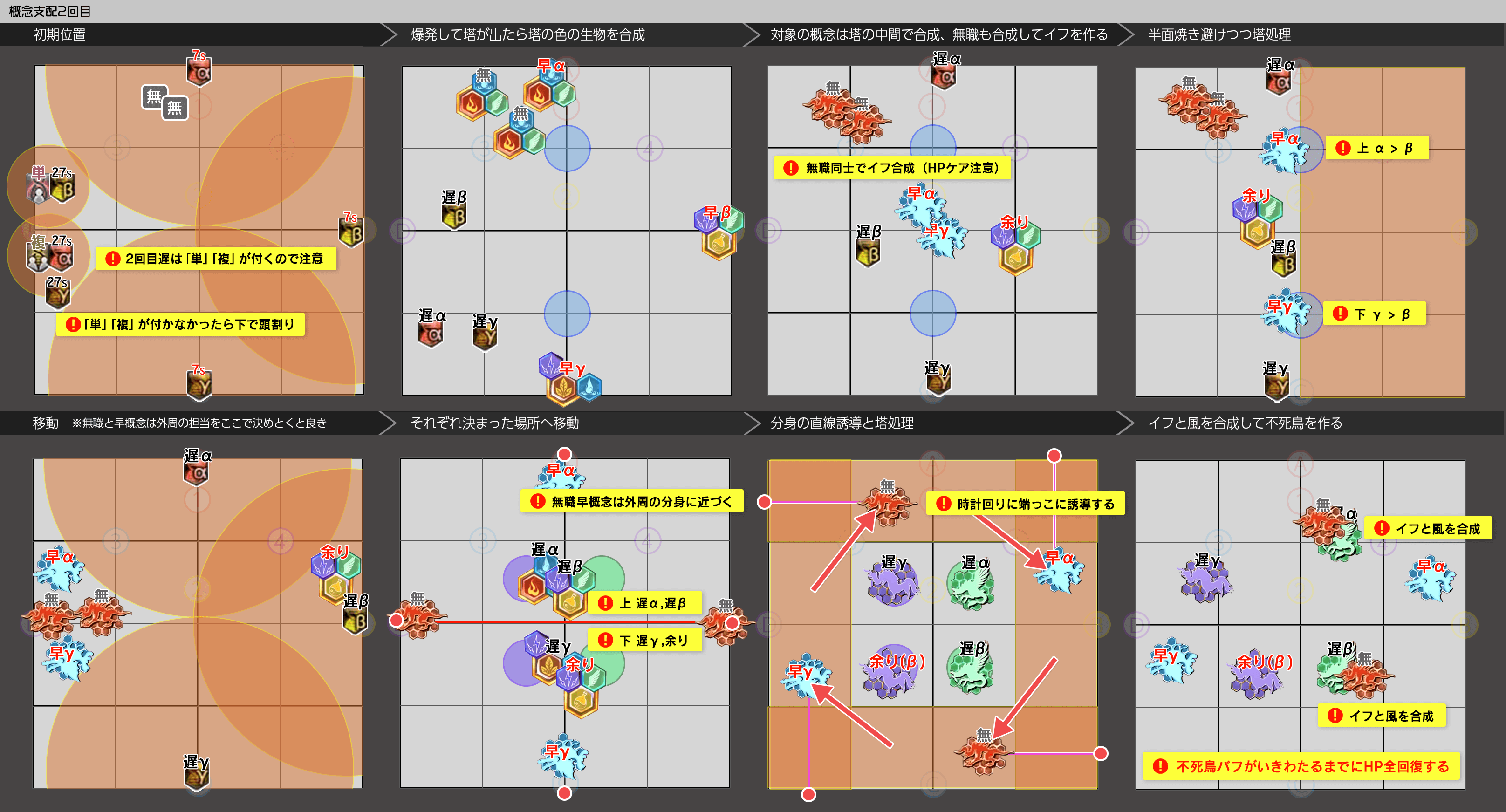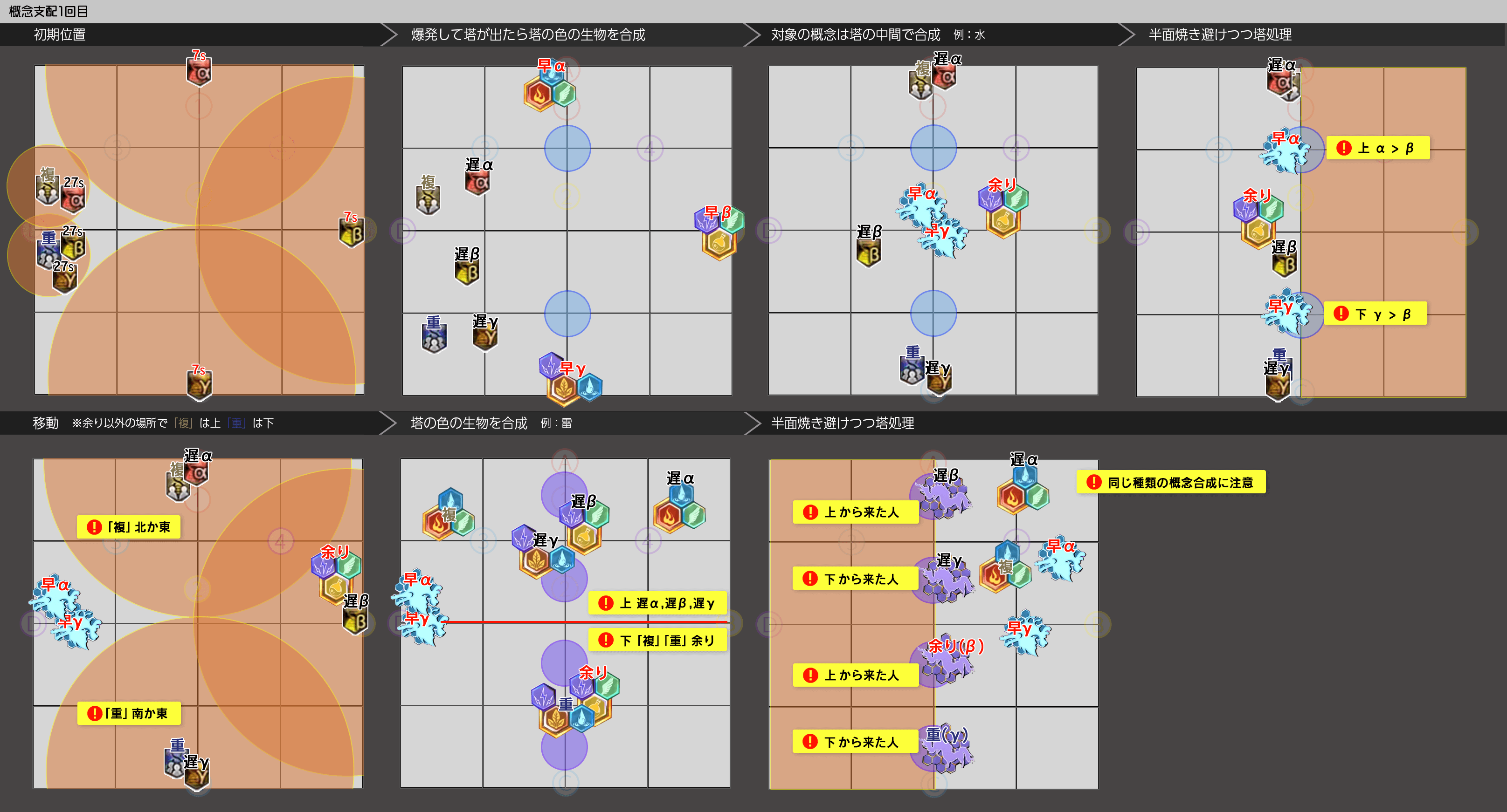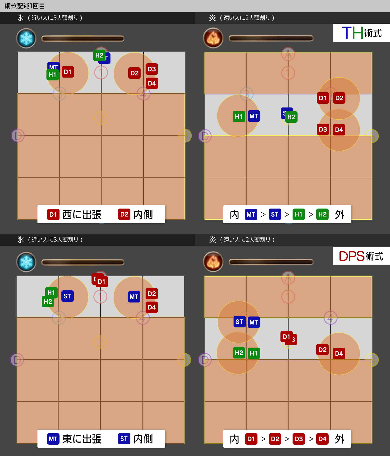 /p 【術式1回目(頭割は西)】【術式炎氷(TH西 DPS東) 】 /p ★ 紫 ST│ ▼炎:中央前詰め ▼氷誘導 /p D1 MT D2 MT │ MT>ST >H1>H2 西 D1>ST /p H1 H2 H1 D2│ D1>D2>D3>D4 東MT>D2 /p D3 S T D4 D1 │【術式2回目散開 】 /p ※左安置は H2 D3│ STMT 紫 D3D1 /p 左右反転→ D4 │ H1H2D4D2 /p 【概念1回目①】 【概念1回目②】 /p 早α │ 遅α /p 複/遅α │ /p 早β │ 生物 遅β /p 重/遅βγ │ /p 早γ │ 遅γ /p ※4塔:遅αβγ→北で合成 /p 複/重/早余り→南で合成