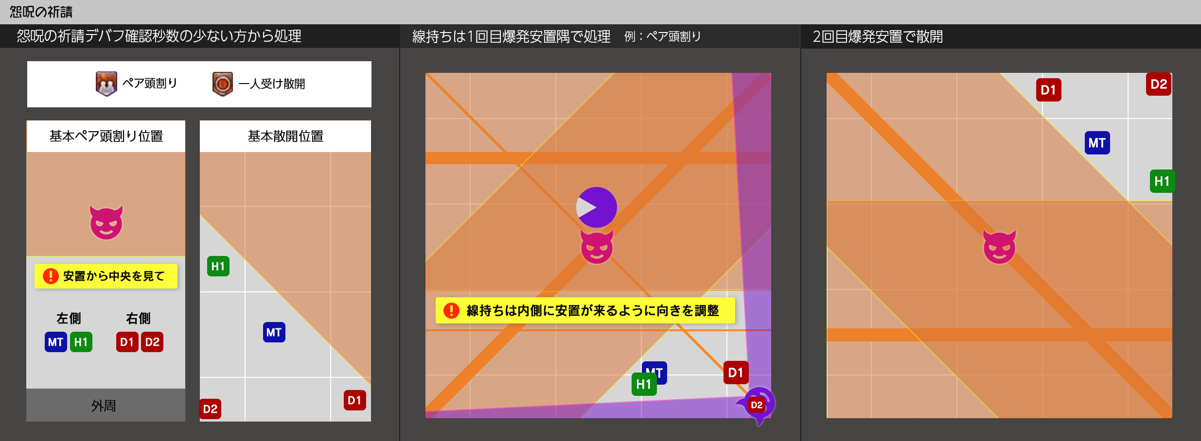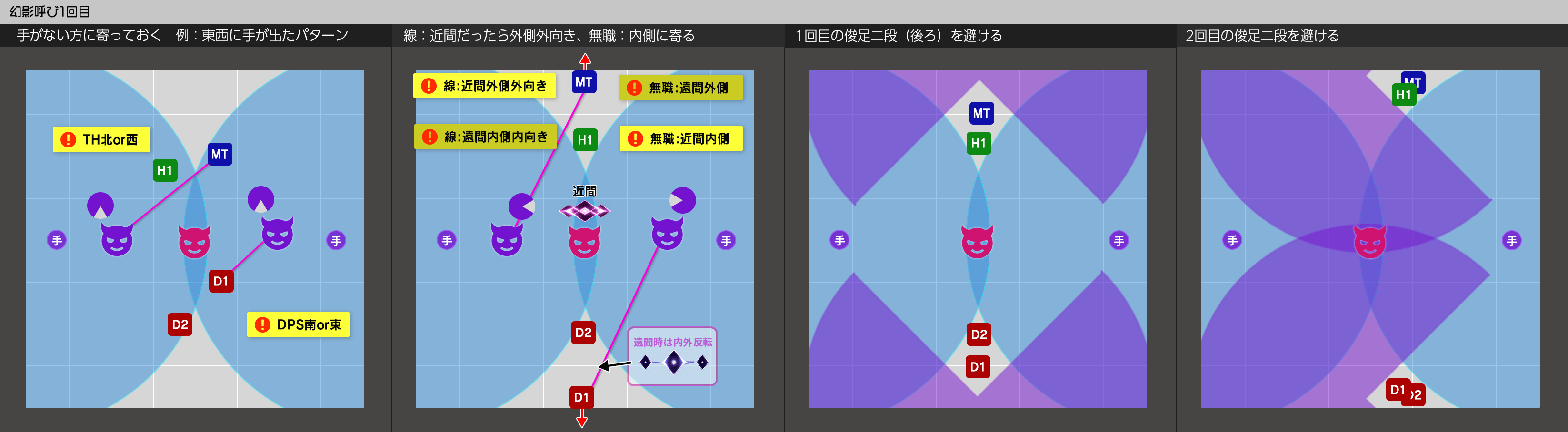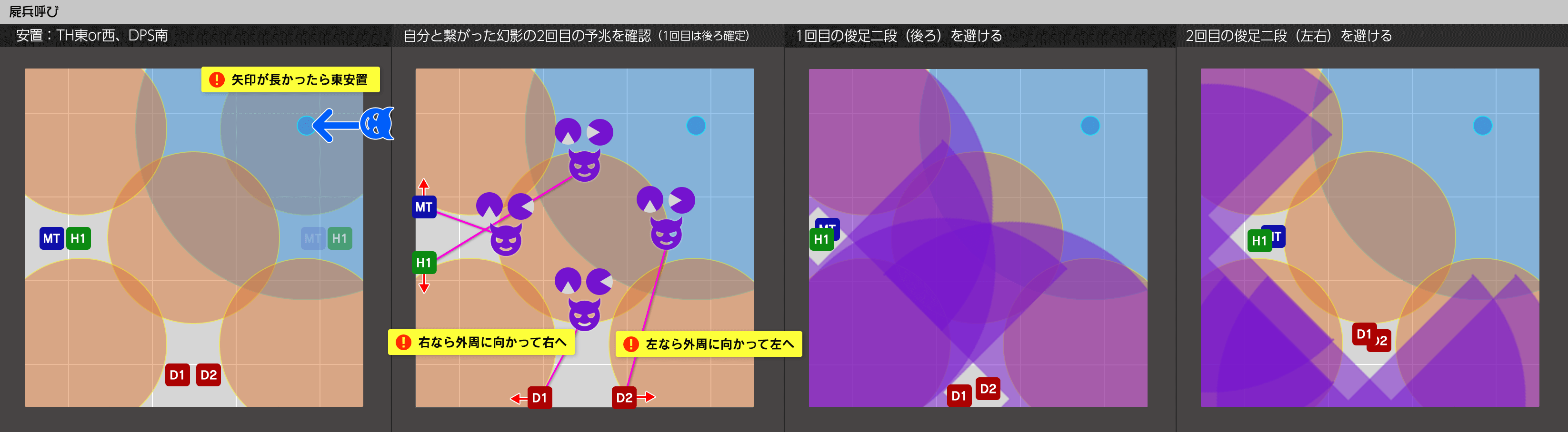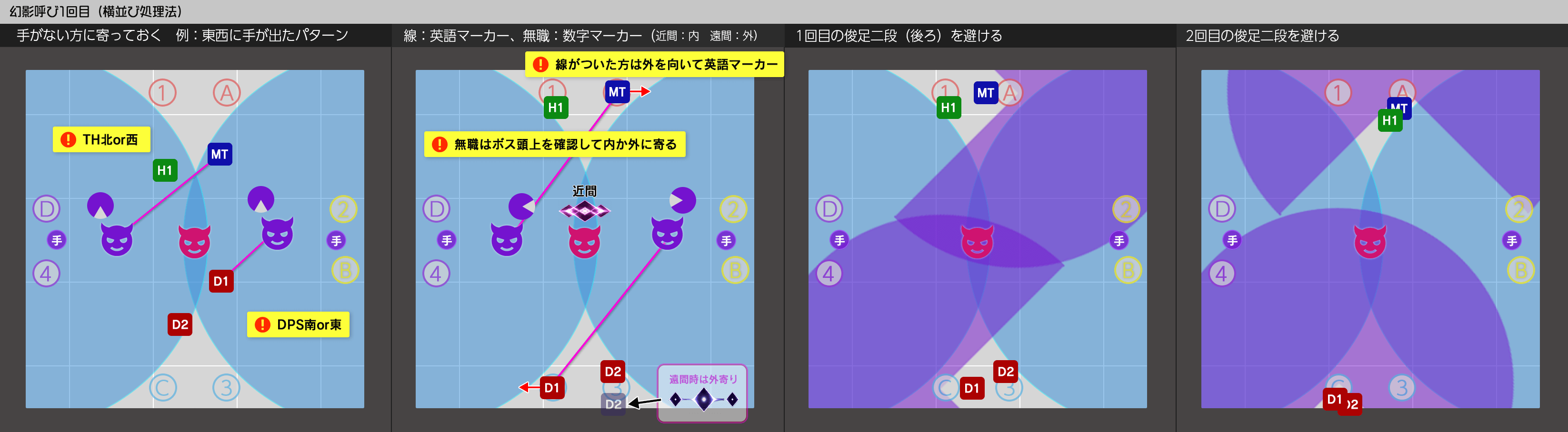 - ボスサークル外の範囲攻撃:タゲサ内へ→青い広がる直線範囲を避ける
